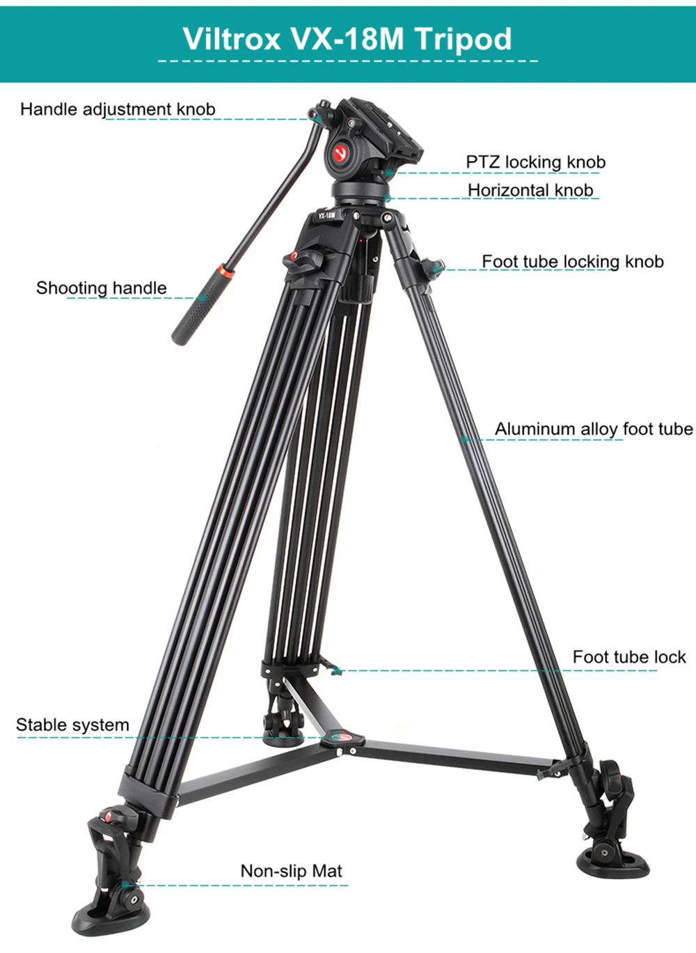 Viltrox VX-18M 1.88m Portable Aluminum Professional Heavy Duty Video Camcorder Tripod with Fluid Head + Carry Bag for Camera DV