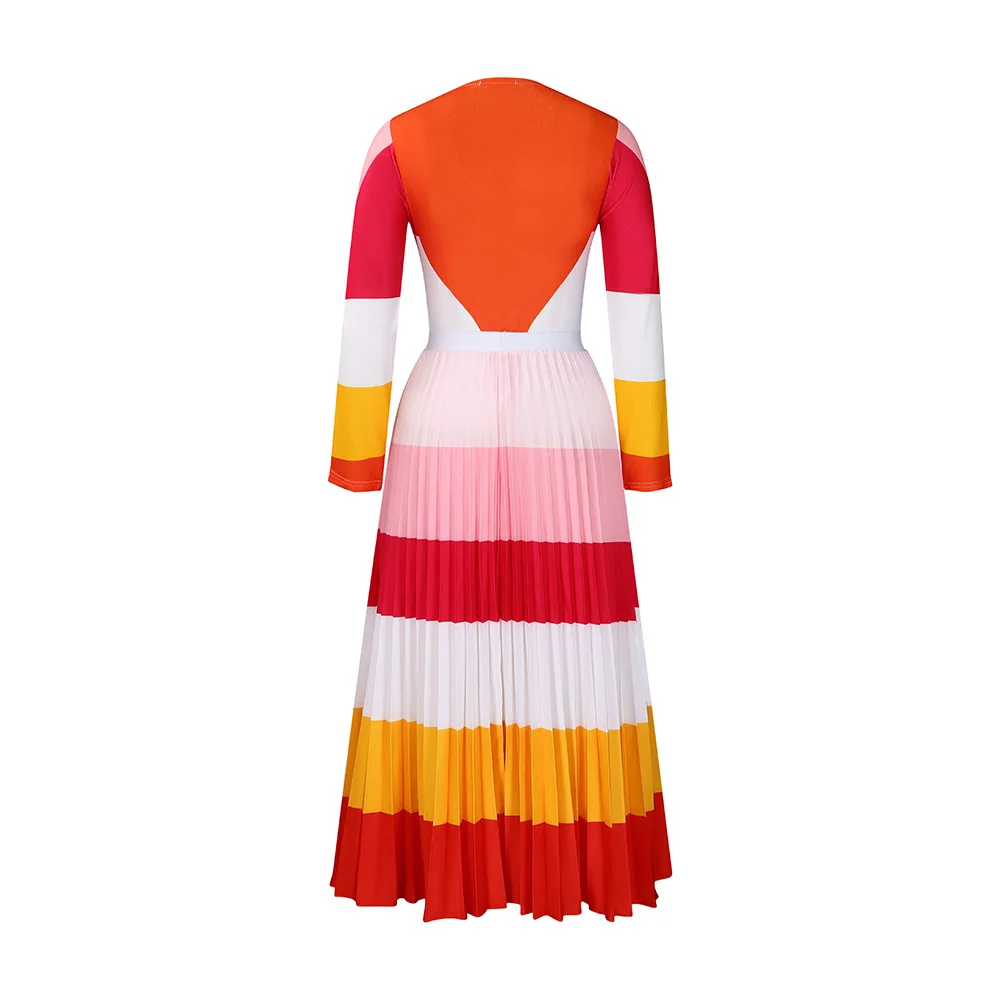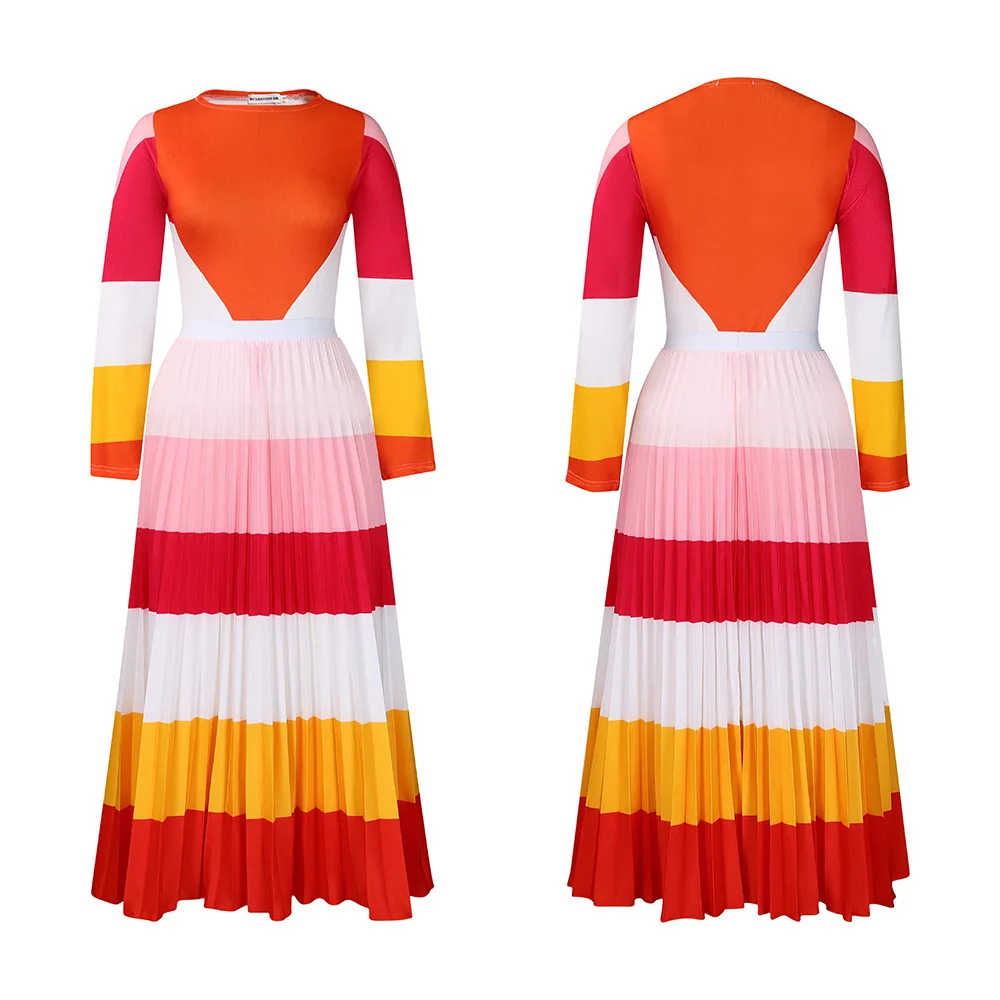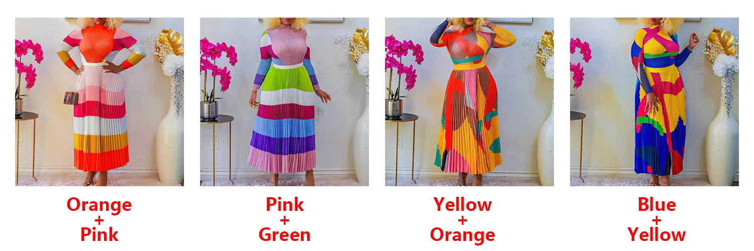 D420 Fall Two Piece Set Women Clothing Long Sleeve Pleated Print Contrast Color Skirt And Top Set For Women 2 Piece Skirt Sets