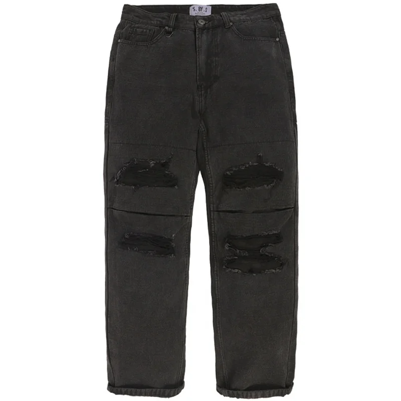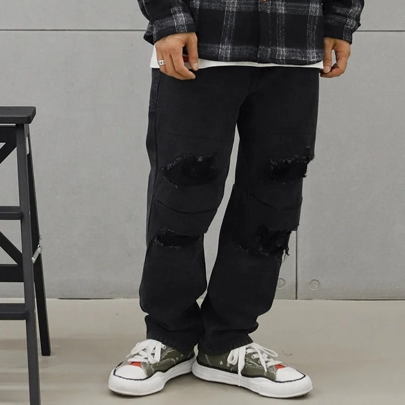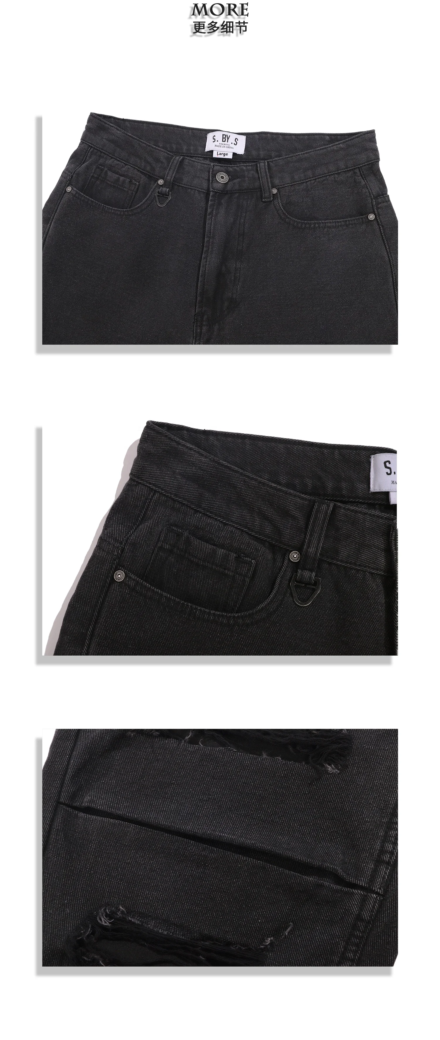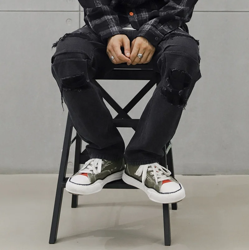 Damage washed black perforated men's jeans pants dark series worn straight pants