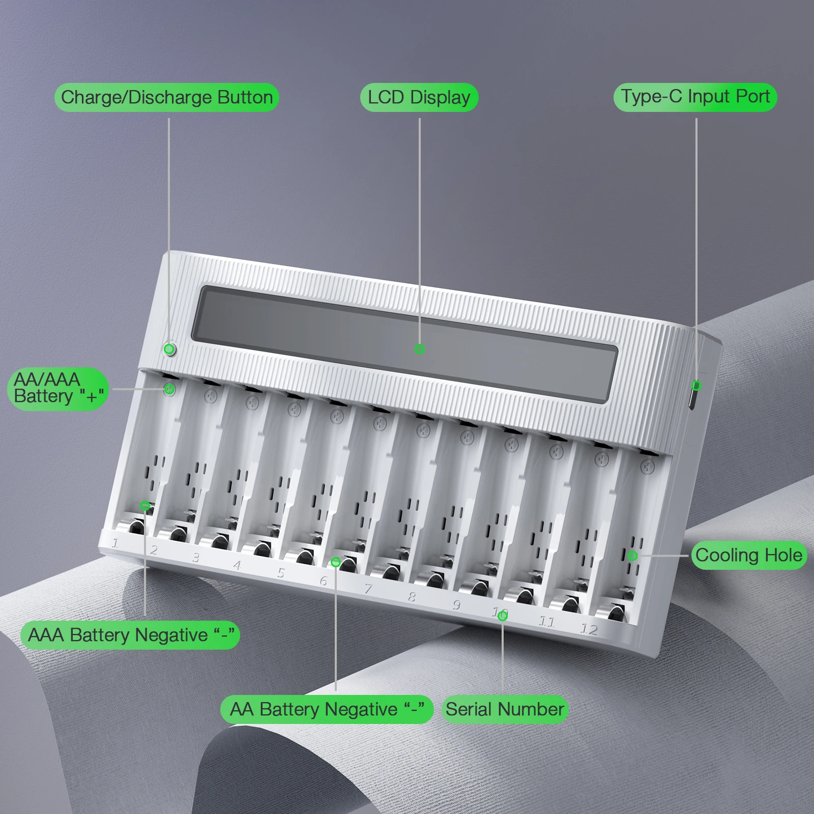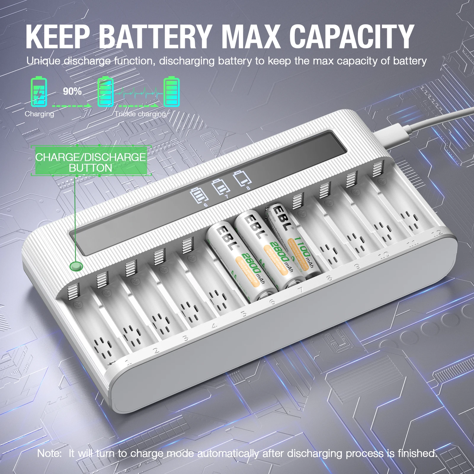 EBL AA AAA Battery Charger 12-Bay Independent LCD Charger for Ni-MH Ni-CD Rechargeable Batteries with Discharge Function