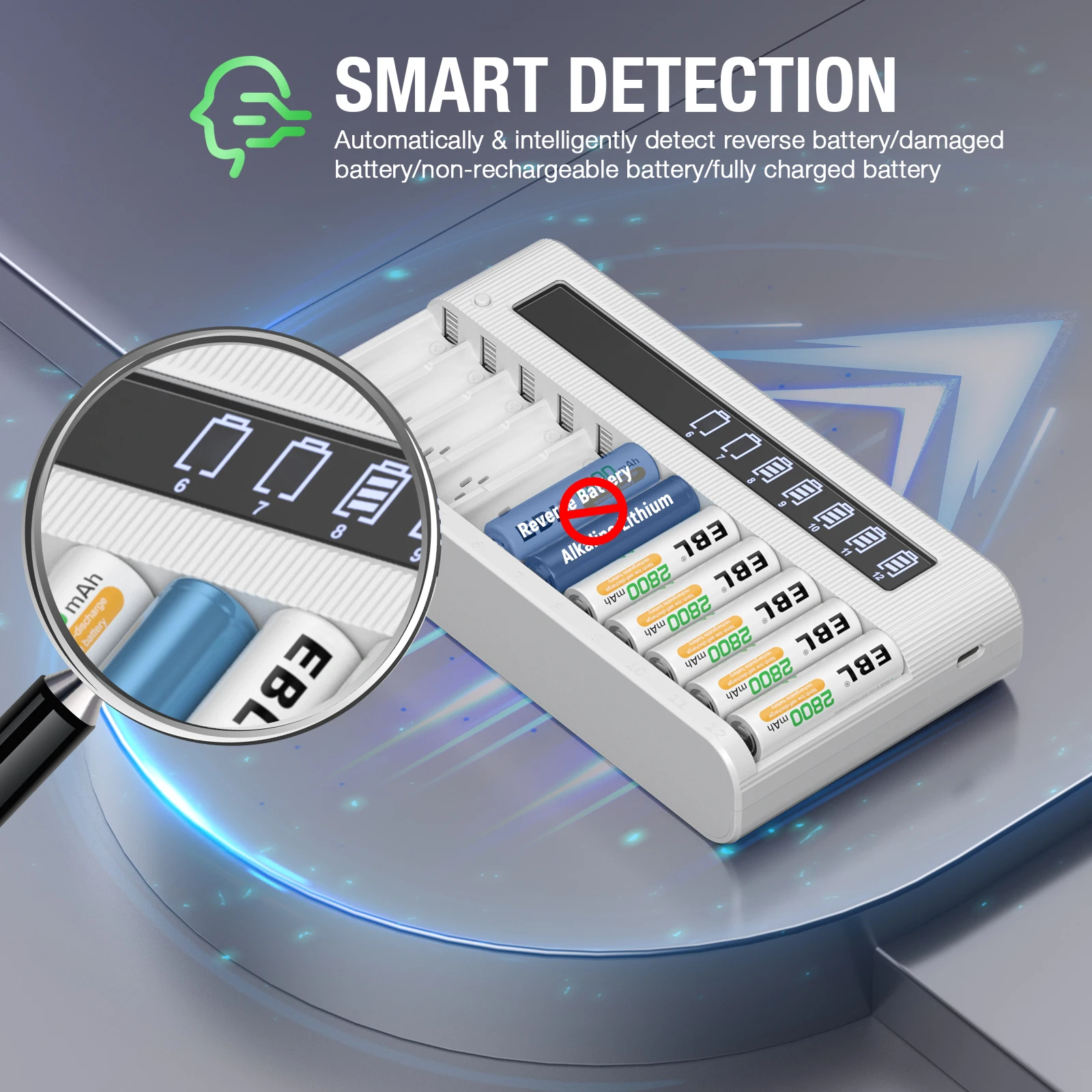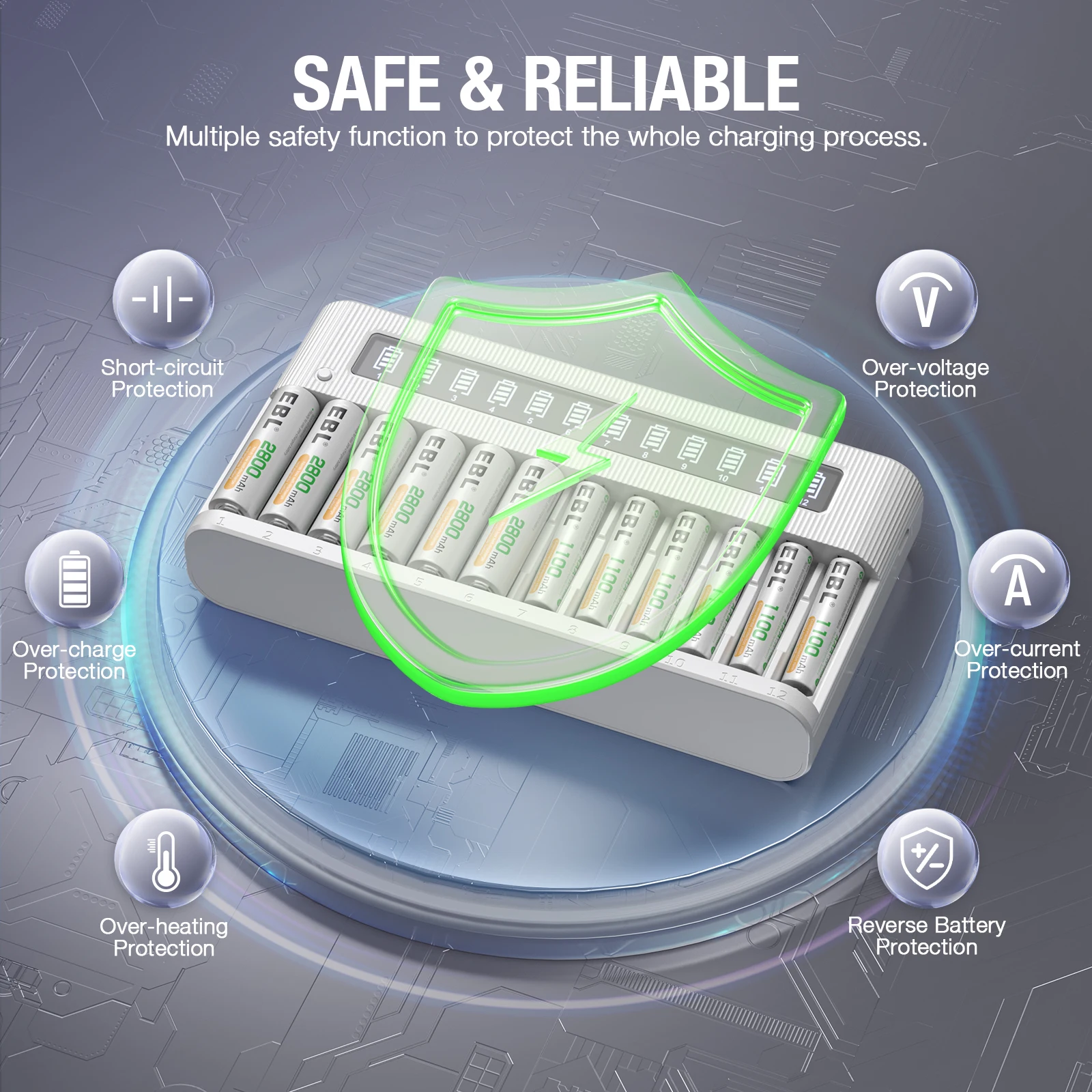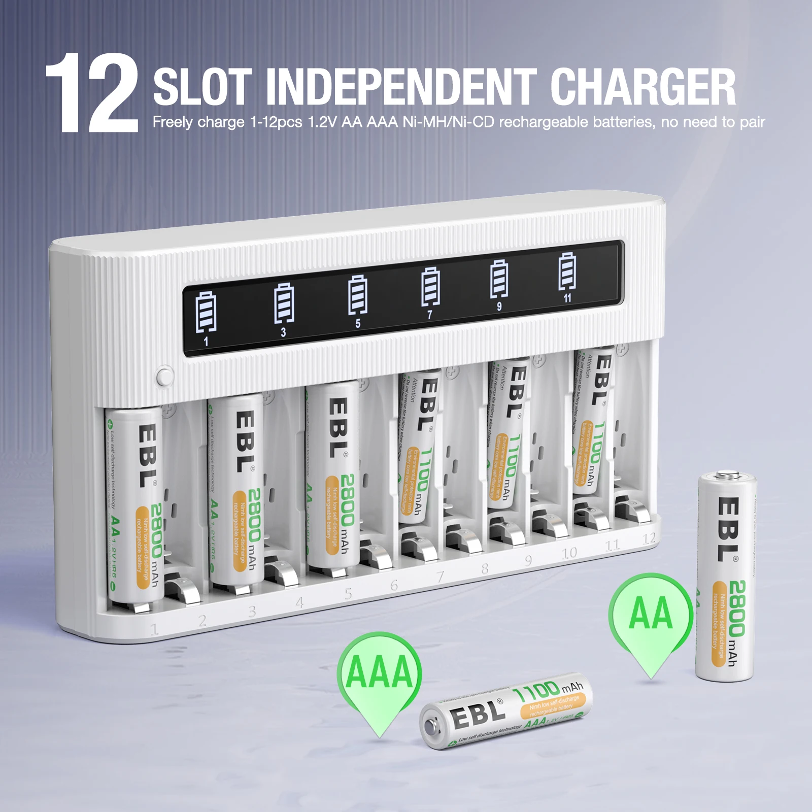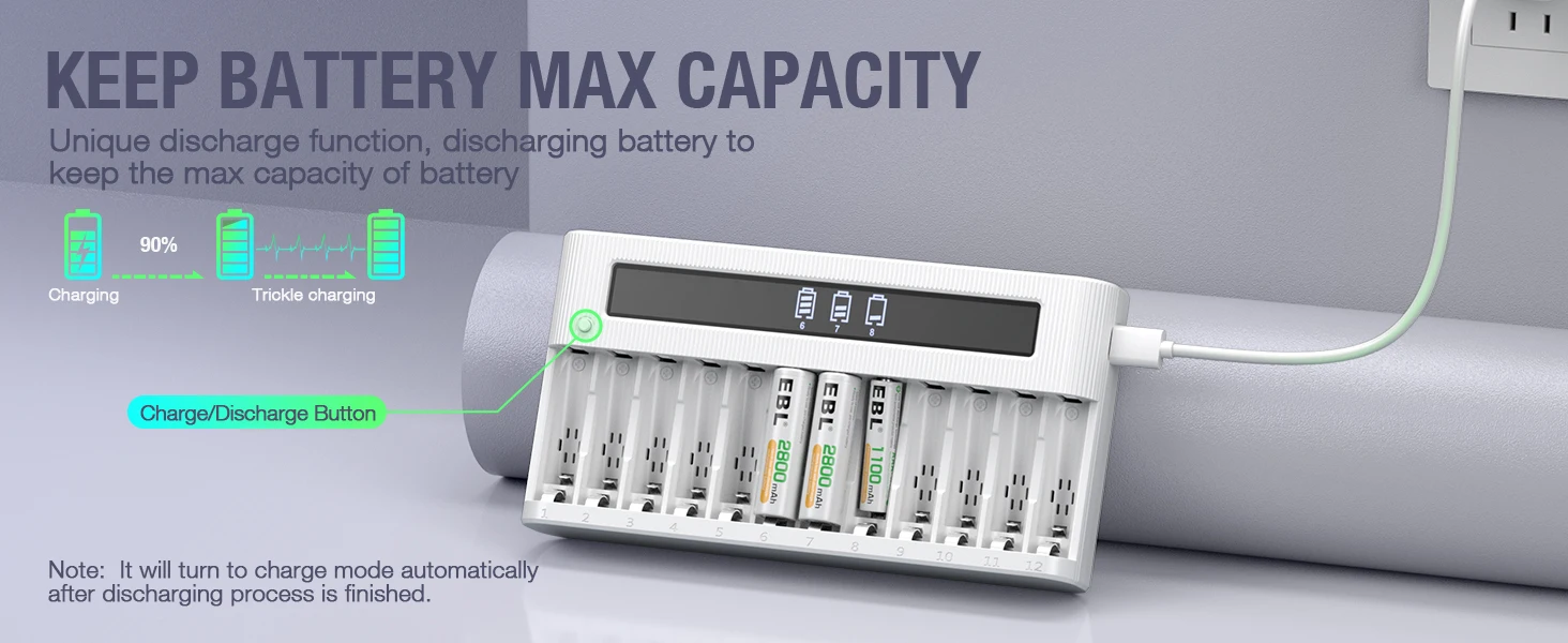 * - Independent Charging Slot: EBL 12-bay smart battery charger can charge/discharge 1-12pcs Ni-MH Ni-CD AA/AAA rechargeable batteries at the same time, more convenient and easy-to use in daily usage.