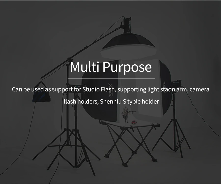This stand supports all major photo equipment including reflectors, softboxes, lights, umbrellas, backgrounds and more.