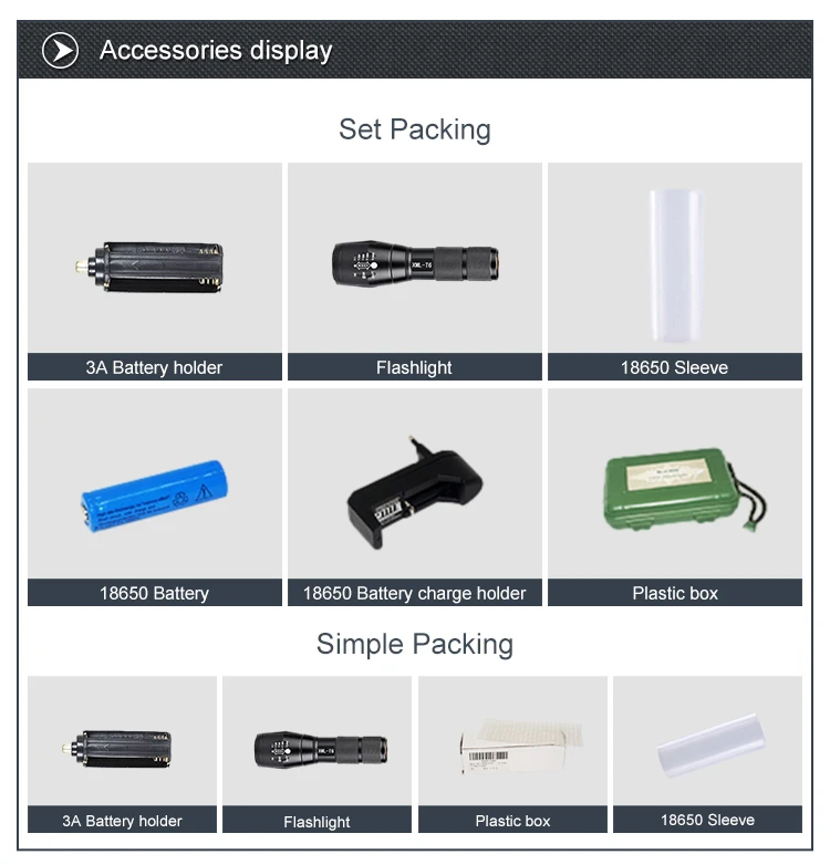 Notice!!!This price is without battery & Charger Only a Flashlight This price is a single flashlight, no battery, charger, etc. If you need a suit (including 18650 battery, charger, gift box), please contact customer service to change the price!
