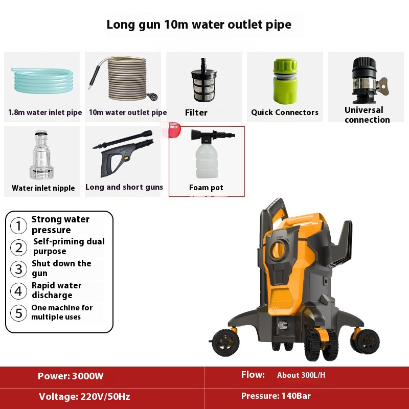 1.8-meter inlet pipe * 1 10 meter water outlet pipe * 1 Filter screen * 1 Quick connector * 1 Universal connector * 1 Water inlet nipple * 1 Dual use long and short guns * 1 Foam pot * 1 Cleaning machine * 1