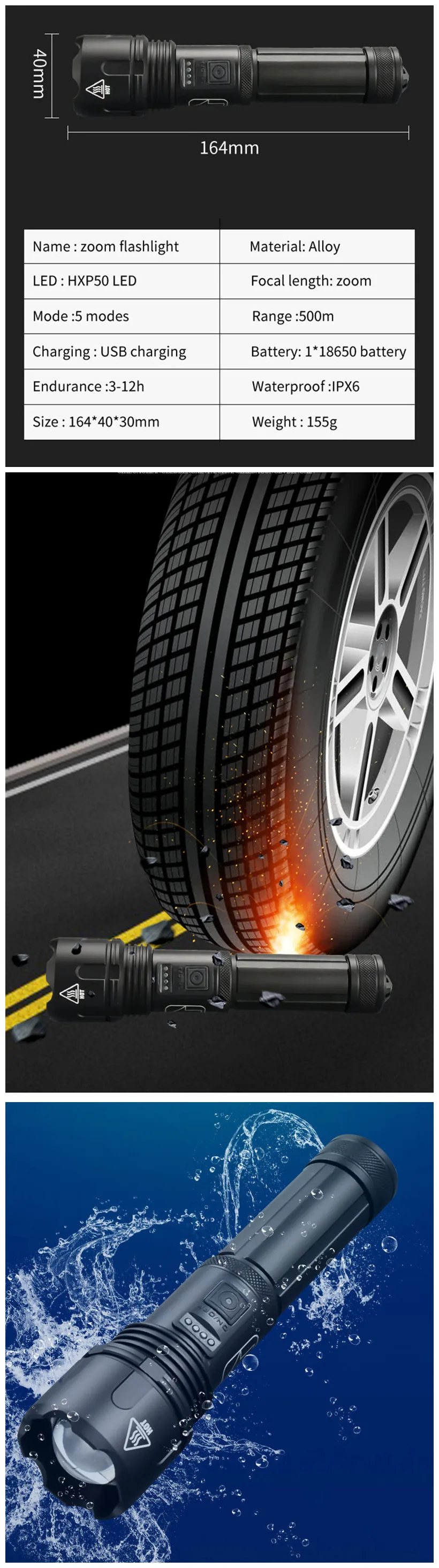 XHP50 Flashlight + 18650 battery + USB cable + Packing box