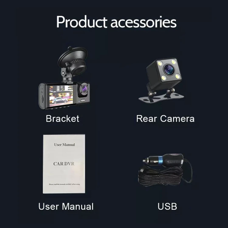 1. Scheme: Lingtong 6248 2. Pixels: front 130W/middle 30W/rear 30w 3. Lens: front GC1054/car 0308/rear OV09 4. Resolution: Front 1920*1080P/ Middle 640*480P/ Back 640*480P/30 frames 5. Screen: 2.0 inch IPS screen 6. Viewing angle: 140 degrees / 90 degrees / 90 degrees 7. Support loop recording, motion detection, date and time watermark 8. Memory card: 128GB max (not shipped) 9. Power interface: USB2.0 10. Battery: 150mAh 11. Output: USB2.0 12. Frequency: 50/60HZ 13. Languages: Russian, Japanese, French, Italian, German, English, Simplified Chinese, Traditional Chinese, Korean, Spanish, Portuguese 14. Working temperature: -20~70 degrees Celsius
