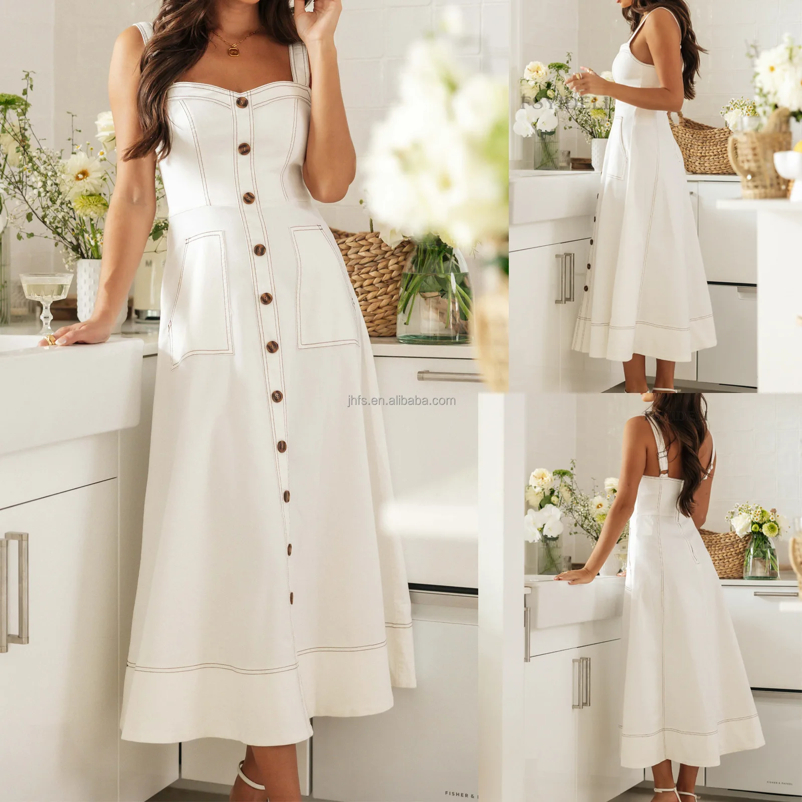J&H 2023 elegance white denim dress Sleeveless button down sexy casual long dress for women