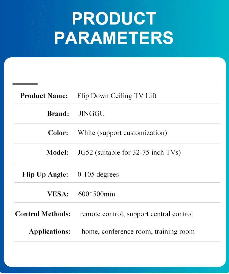 JGST high quality swivel 0-105degree Adjustable ceiling 75 inch tv lift mechanism with Remote motorized lift tv for living room