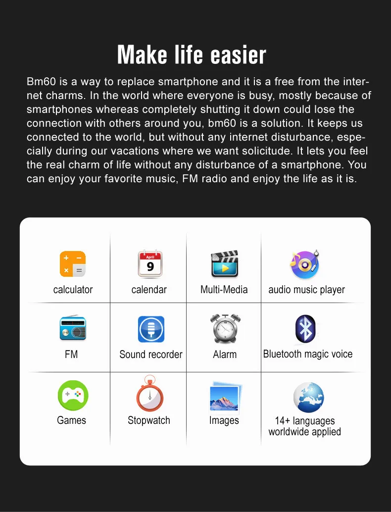 Bluetooth dialer, sound recorder, alarm, calendar, calculator, media player etc.