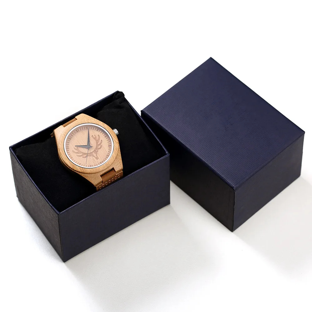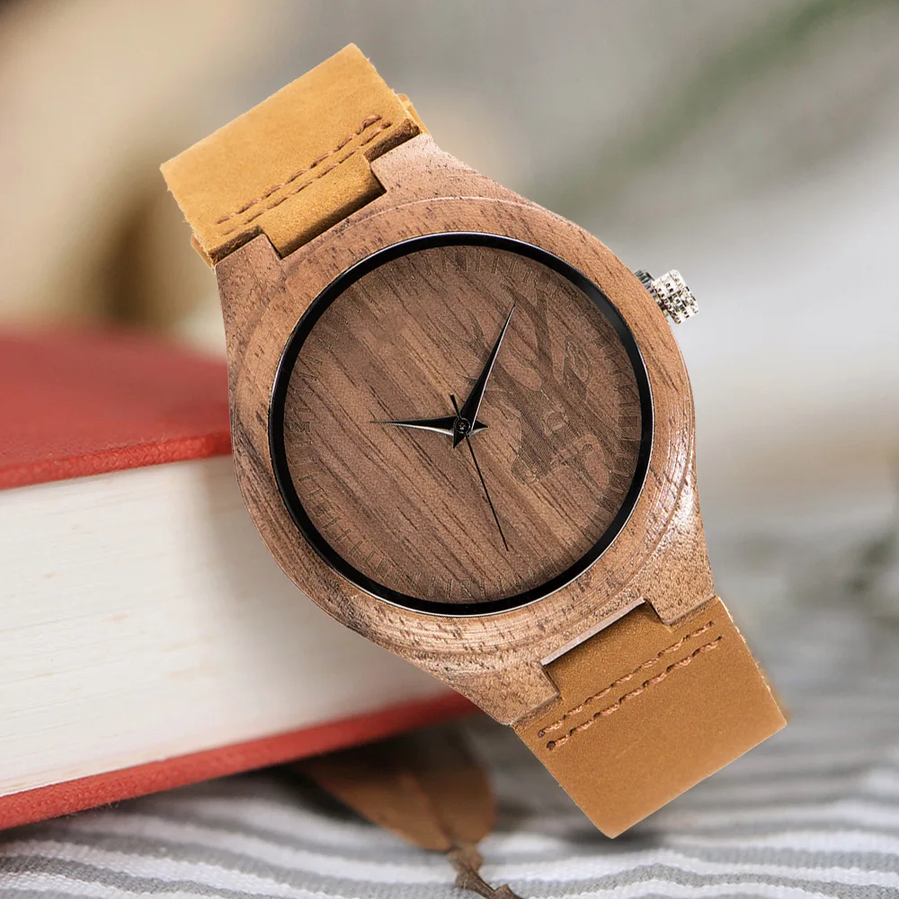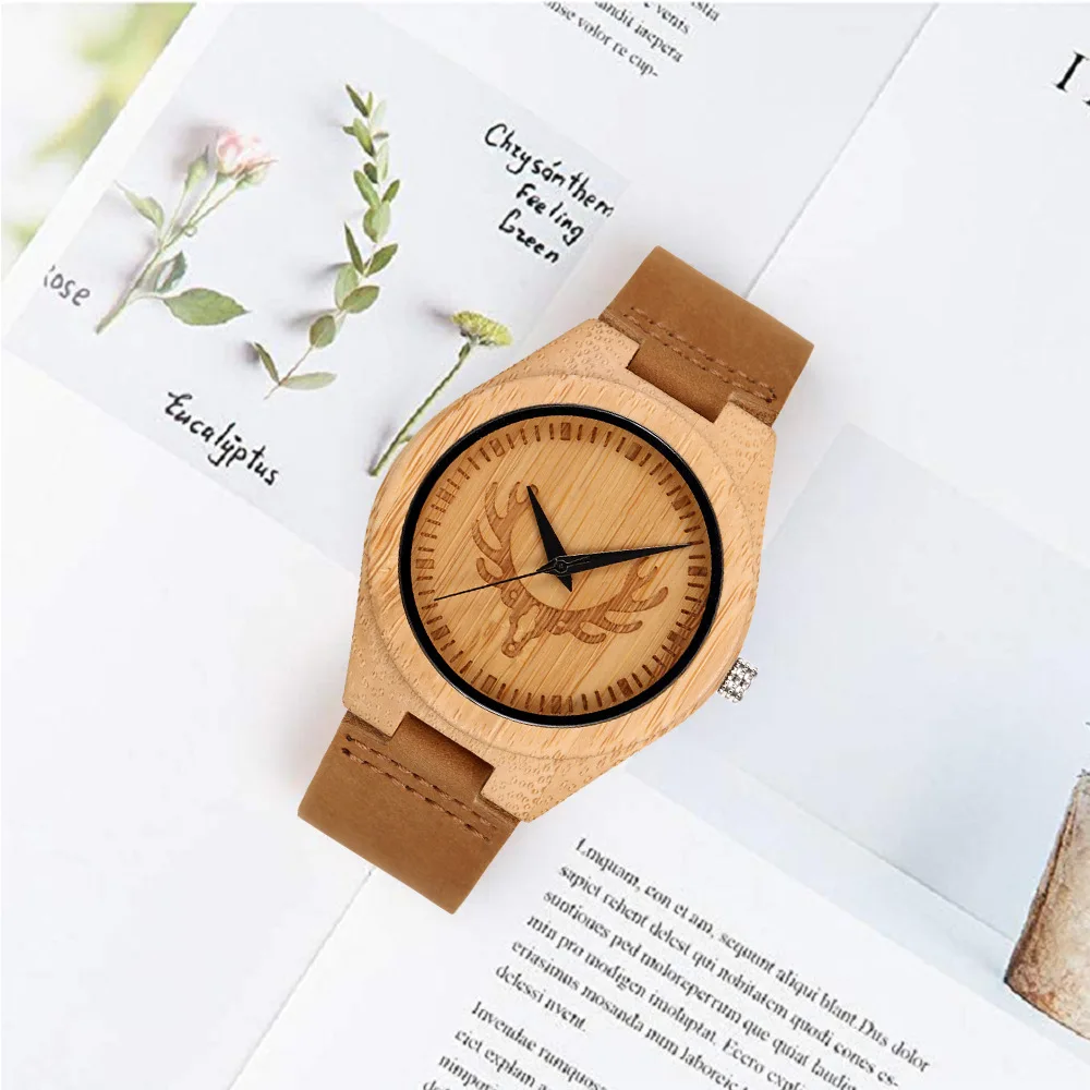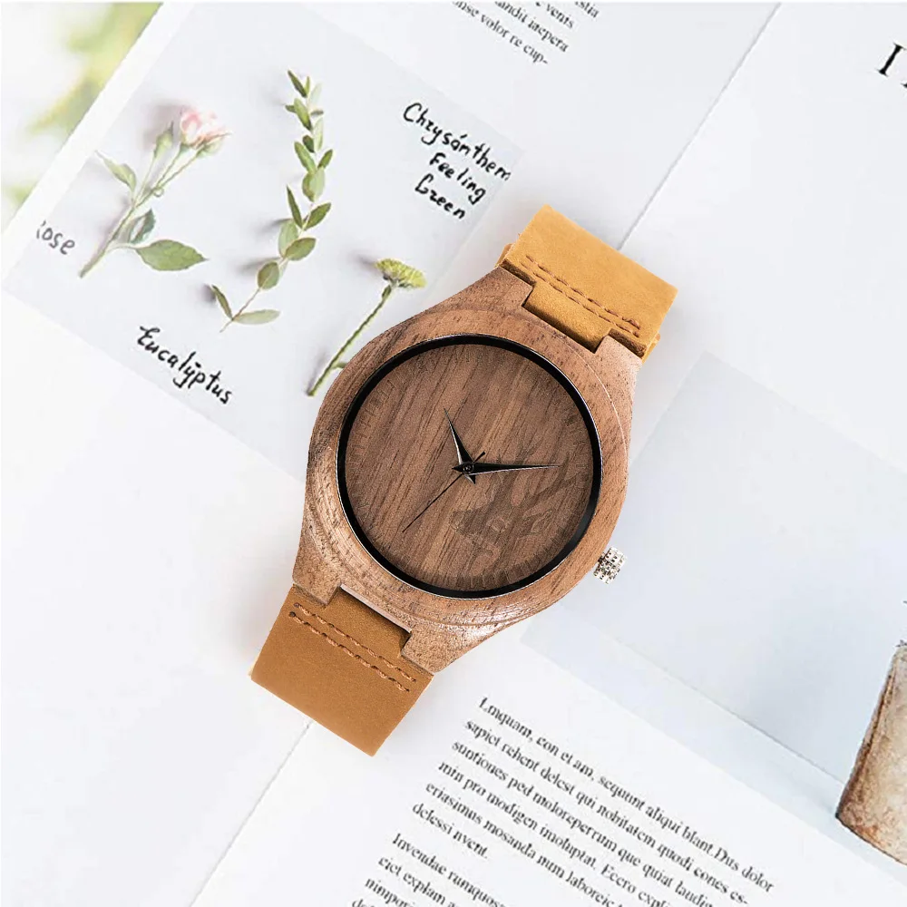 Luxury Classical Elk Head Natural Wooden Watches With Genuine Cowhide Leather Lovers Luxury Wristwatch Mens Wood Watch