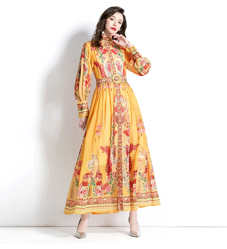 2023 Spring and summer standing collar wide dress for retro print long dress KL6635078