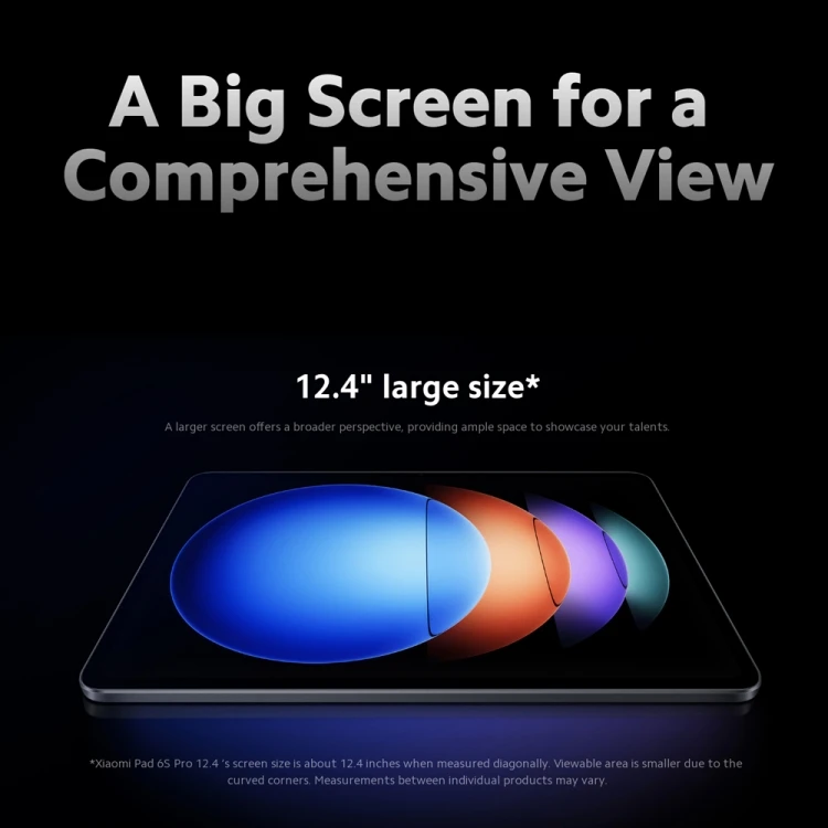 1. Dimension: 278.7x191.58x6.26mm 2. Weight: 590g 3. Display: 12.4 inch 3K LCD screen, 3048x2032 resolution, 294 PPI, screen ratio 3:2, up to 144Hz refresh rate, up to 360Hz finger touch sampling rate, 240Hz stylus touch sampling rate, support HDR10, Dolby Vision, reading mode, sunny screen, Rheinland hardware low blue light certification. 4. CPU: Snapdragon 8 Gen2 octa core up to 3.19GHz 5. GPU: Adreno 740 5. RAM+ROM: 8GB+256GB / 12GB+256GB / 12GB+512GB / 16GB+1TB 7. OS: Xiaomi HyperOS 8. Front camera: 32MP camera, support short video recording, portrait mode, portrait virtualization, front and back dual view, voice subtitles, video filters, countdown photography, AI beauty, motion photos, voice controlled photography 9. Rear camera: 50MP main camera, 2MP depth of field sub camera, support short video recording, portrait mode, portrait virtualization, director mode, front and rear dual view, super night view 2.0, document mode, AI watermark, AI beauty, ID card photocopying mode, voice subtitles, video filters, video beauty, video stabilization, motion photos, countdown photography, HDR, custom watermark, voice controlled photography 10. Battery capacity: 10000mAh, 120W USB Type-C wired charging 11. Speaker: 6pcs, microphone: 4pcs 12. USB interface: USB Type-C 13. WI-FI: Wi Fi 7 protocol, 802.11 a/b/g/n/ac/ax, 2.4GHz&5GHz dual band 14. Wireless: 5.3, supports AAC / LDAC / LHDC5.0 / LC3 / Auracast 15. Sensors: Acceleration sensor, gyroscope, front ambient light (color temperature) sensor, rear ambient light sensor, flicker sensor, hall sensor, side fingerprint, geomagnetic sensor, proximity sensor, status indicator light 16. Languages: English, Simple Chinese, Traditional Chinese 17. Package Contents: - 1 x Tablet PC - 1 x Power adapter - 1 x USB Type-C cable - 1 x User manual