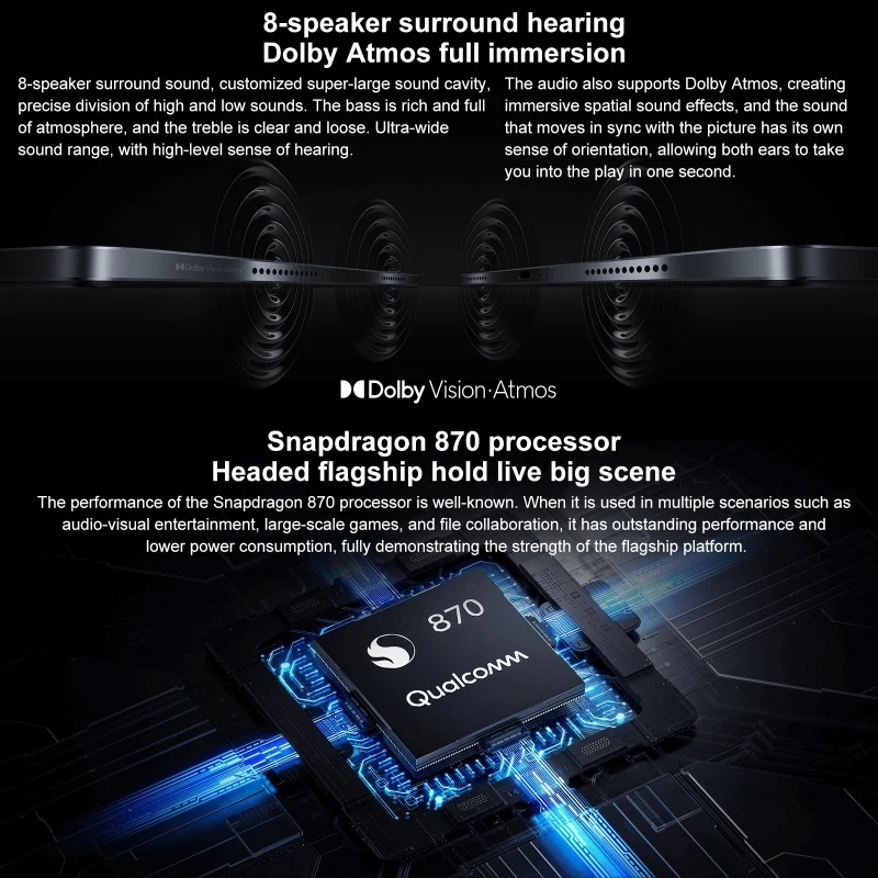 3. 11.0 inch screen, smaller body, 2560x1600 WQHD+ resolution, 275 PPI, 1500:1 contrast ratio, 120Hz refresh rate, 120Hz finger touch sampling rate, 240Hz stylus touch sampling rate, support Dolby Vision, reading mode, sunny screen 2.0, TrueTone true color display, Rheinland hardware low blue light certification.