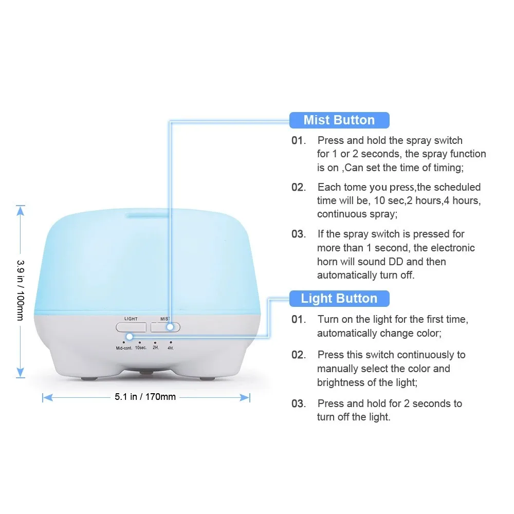 7 color-changing LED lights, light and dark mode, you can choose your favorite color, two fog modes, you can adjust the fog size according to the environment Bass and low noise operation, creating a quiet atmosphere, not disturbing sleep, moisturizing and delicate, soothing fatigue Aromatherapy essential oil diffuser can fill the room with the aroma of essential oils It can help sleep It hydrates up to 30ml/hour. Humidifier function can better replenish moisture It is a great gift, the best choice for family and friends when the holidays are approaching