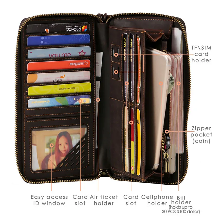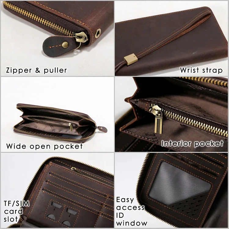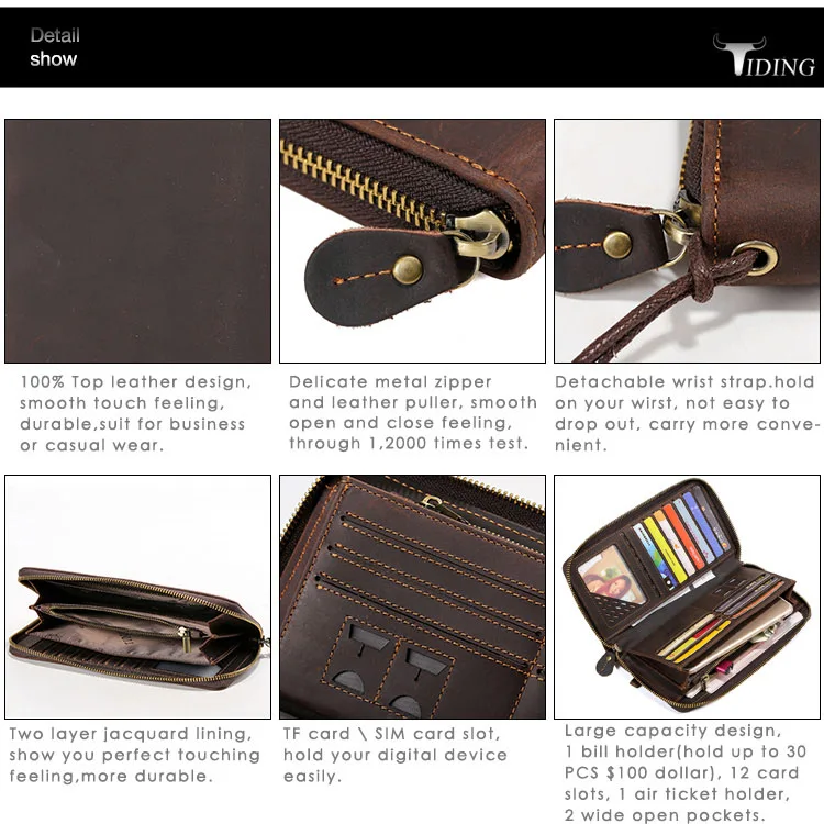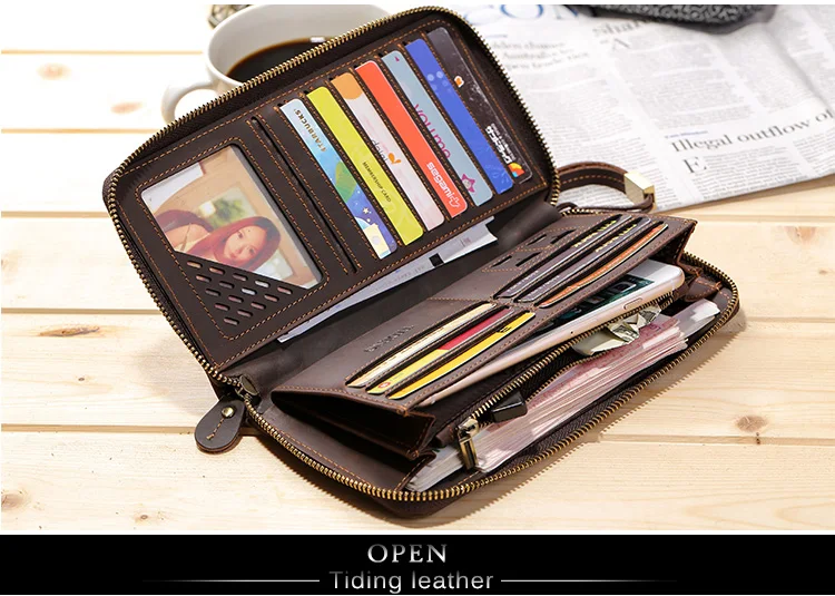 TIDING Retro Large Leather Casual Mens Clutch Travel Wallet Genuine Cowhide leather Business Long wallet