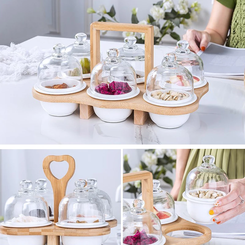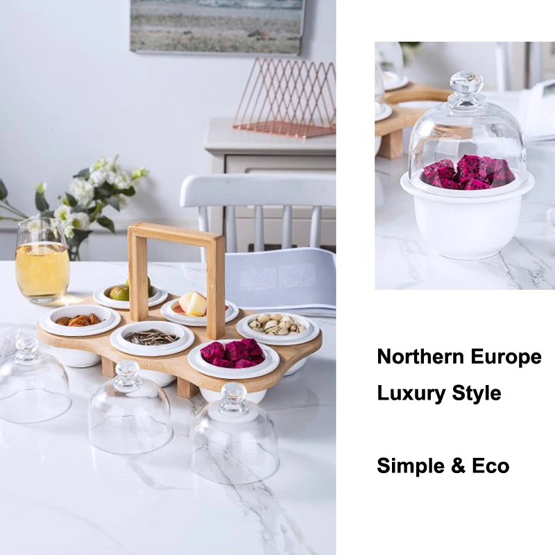 Wholesale Large Bamboo Decorative Appetizer Serving Dip Platters Tray with Compartments with Ceramic Dip Bowl