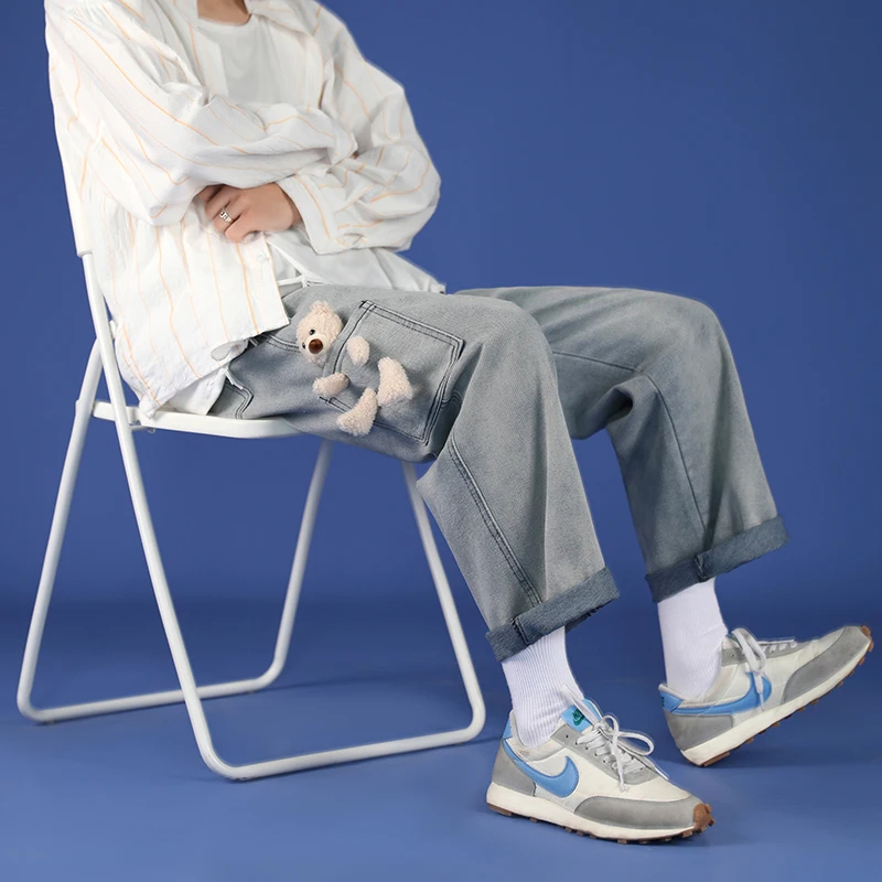 Wide leg jeans men's winter thickened mesh red bear pants straight loose boy's denim jeans